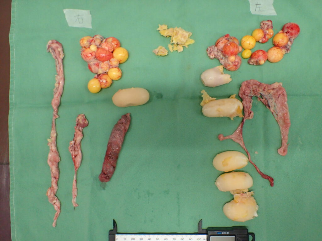 強いいきみによって生じた卵管のお尻からの脱出(卵管脱)。
