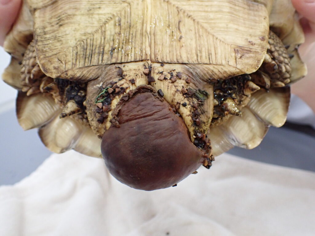 膀胱結石のいきみによって結腸脱を起こしたケヅメリクガメ。