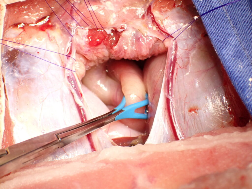 緊急手術によっておなかの中から結腸の腸重積を整復しているところ。