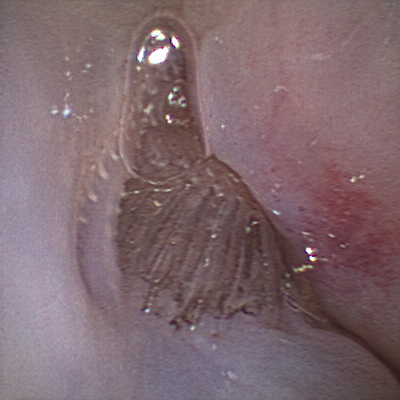 食道内視鏡検査の結果、食道内に異物(プレコ)がひっかかって粘膜に充血が認められました。
