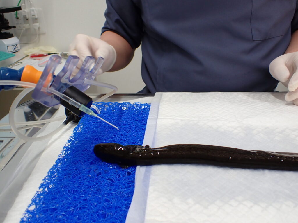 プレコを飲み込んだ後から食欲がなくなってしまったグレーターサイレンの患者さん。