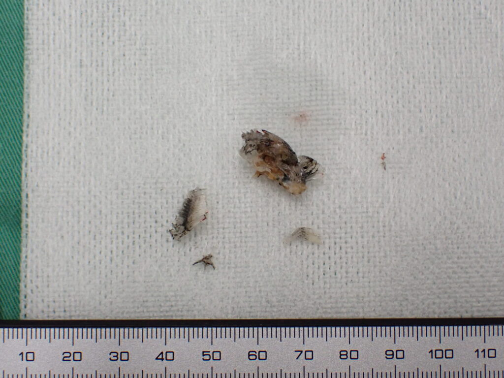 摘出された、プレコの鰭と骨からなる異物。