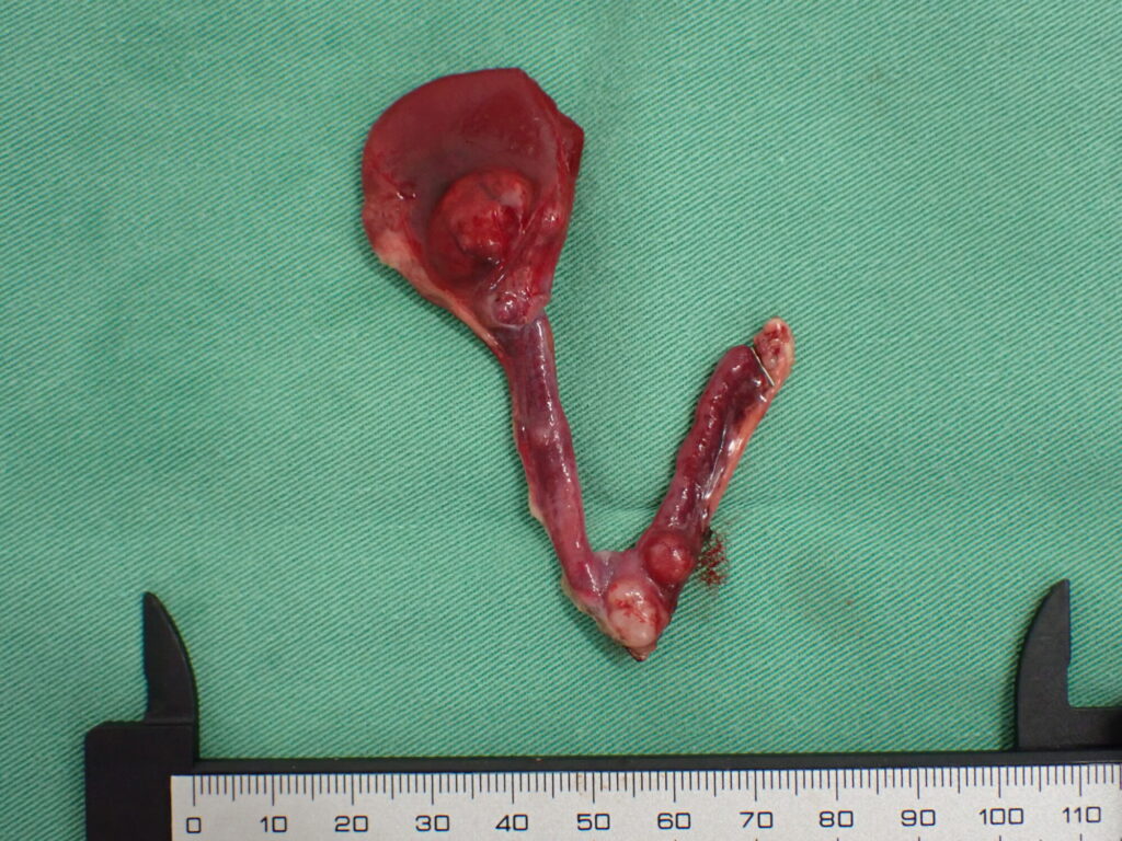 手術によって摘出されたゴールデンハムスターの子宮および卵巣腫瘍。
