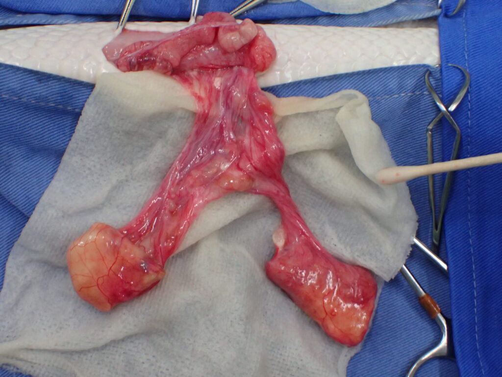同時に存在していた卵管のなかの卵材(未完成な卵)の摘出。