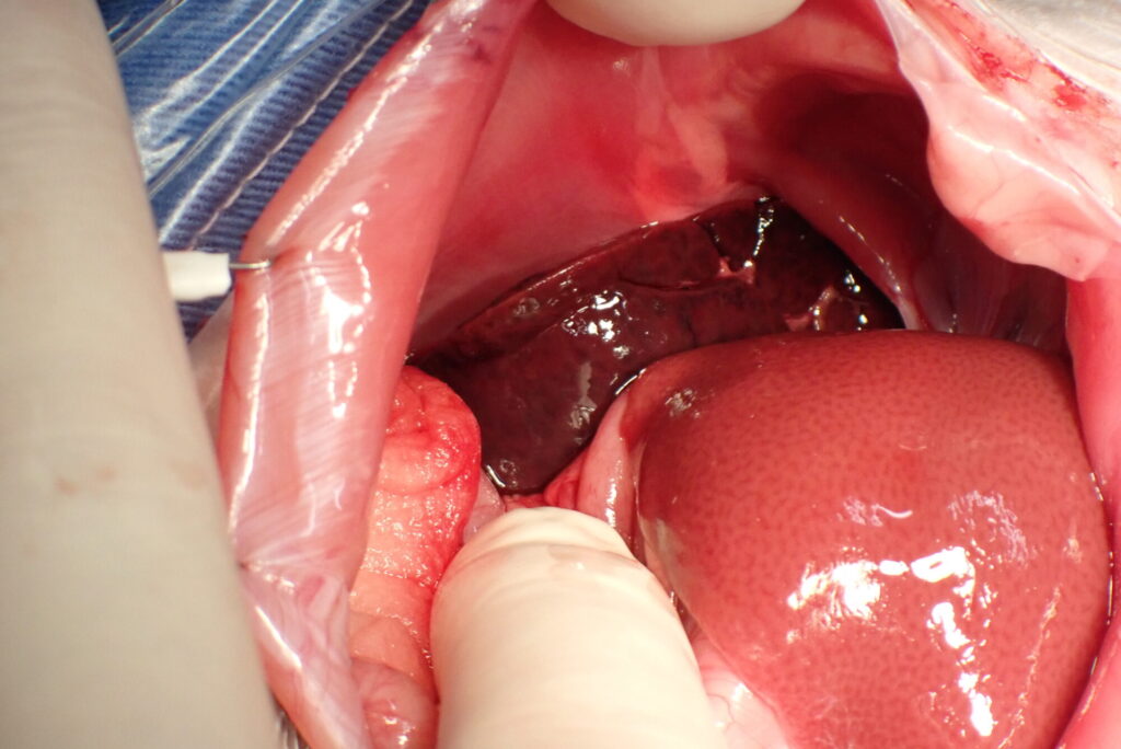 肝葉捻転のウサギの手術写真。手前の正常な肝葉に比べて、奥のねじれた肝葉は暗い赤色になっています。