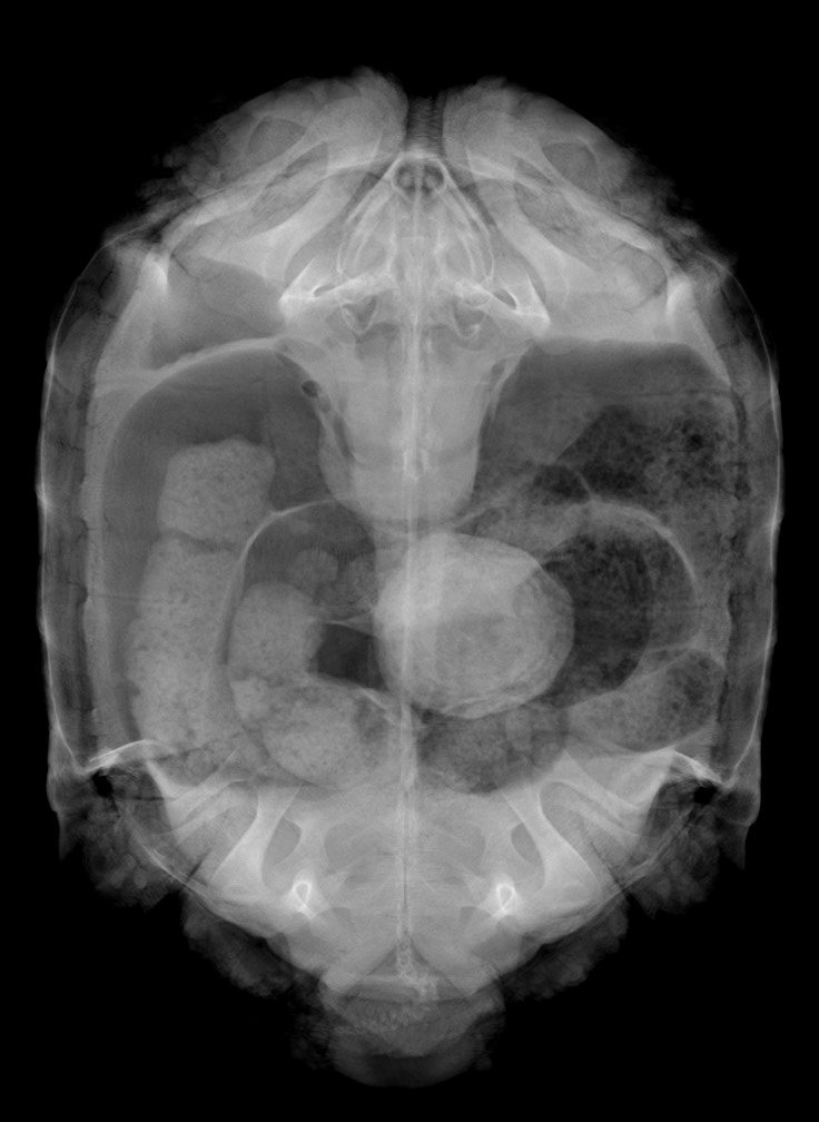 膀胱結石が見られるケヅメリクガメのレントゲン写真。